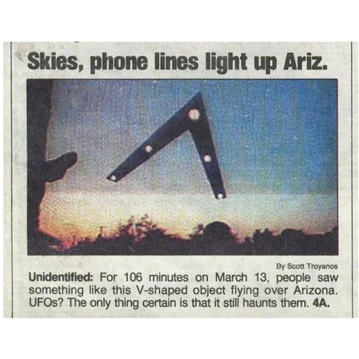 This high-waisted tee features a bold graphic and the text: "In 1997, hundreds of people witnessed a massive, mysterious V-shaped craft with lights as it drifted slowly across the night sky over Phoenix, Arizona."